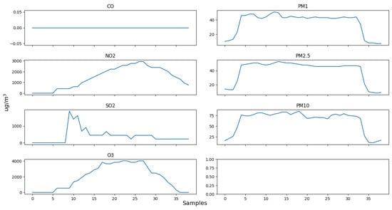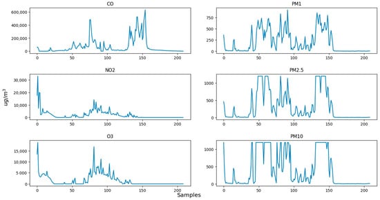 Figure 6a,b illustrate pollutant measurements for O3 and PM2.5 within a specific geographical zone, respectively.