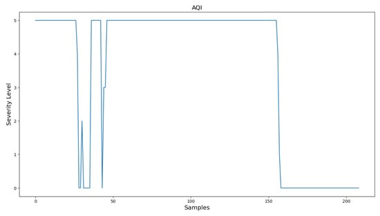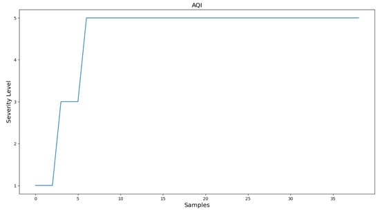 Accordingly, the AQI for the second experiment is illustrated in Figure 14. Values 0 to 5 in the y-axis depict step-wise the values of the AQI. ‘Good’ corresponds to 0 and ‘Extremely Poor’ corresponds to 5. We can obviously verify the same result extracted previously. The AQI is constantly high, aside from values 28 to 40, where the fire has been suppressed, and after observation 155, where the system is removed from the source of fire. The difference between that interval and the concentrations interval is due to the spike of the particulate matter. Nevertheless, the overall result verifies what is resulted from the previous figure.