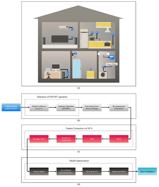 Figure 2 provides an overview of the proposed system for load recognition, where the collection and transmission of data are carried out through smart outlets and the controller, respectively. Both the smart outlets and the controller are illustrated in the blue color. In the second panel, the collected data are highlighted in blue, while the preliminary data processing blocks are represented in light gray. In the sequel, we have the feature extraction stage utilizing the NCA technique, represented in red. Subsequently, in dark gray, in the last part of the flowchart, Figure 2 depicts the stage responsible for the ML model optimization, aiming for the enhanced performance of the classifiers. At the end, depicted in light blue, the system presents the type of appliance in operation.