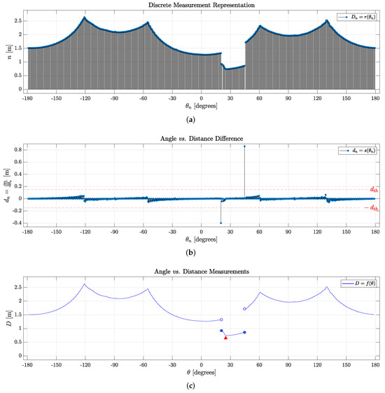 where domain indicates a set containing each discrete angle within the angular scan range, and co-domain denotes the set of measurements assigned to each angle . Such a discrete function is shown in Figure 3a.