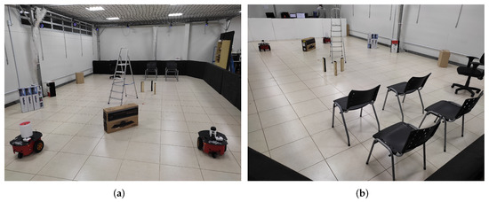 Figure 4 provides a visual representation of the experimental environment employed for validating the mathematical representation of the sensor data. In the depicted views, one can observe rectangular boxes, chairs with legs and wheels, a four-legged ladder, a second mobile robot, and the surrounding walls that define the scenario. This configuration facilitates the identification of objects based on the discontinuities observed in the measurements, as conceptualized in Section 2.