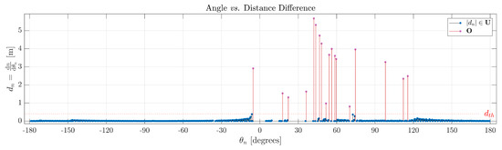 whenever . Here, denotes the set cardinality of (representing the sensor’s resolution) and is a case-specific threshold value, serving as a free parameter that represents the minimal difference in distance measurements for object detection. To automate the object detection and identification process, a metric for can be computed as the mean absolute difference value