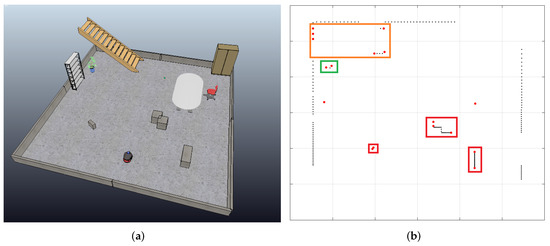 To exemplify the identification of objects during the robot’s navigation, the first row of Figure 6 showcases three snapshots of the robot’s path. The second row of Figure 6 displays the corresponding 2D LiDAR scans, while the third row presents the 2D reconstruction of the world from the mobile robot’s perspective, with the blue bounding boxes representing the identified objects. Video https://youtu.be/X57udApLx1w (accessed on 30 March 2024) demonstrates the execution of this experiment. Moreover, to further augment our understanding of the environment, additional visualizations are provided in Figure 7. Figure 7a shows the point cloud of measurements accumulated throughout the entire experiment, offering a comprehensive overview of the captured data. Conversely, Figure 7b presents an occupancy grid derived from laser measurements, providing a structured representation of the environment’s occupancy status. Together, these visualizations enhance our comprehension of the robot’s navigation process and its interaction with the surrounding environment.