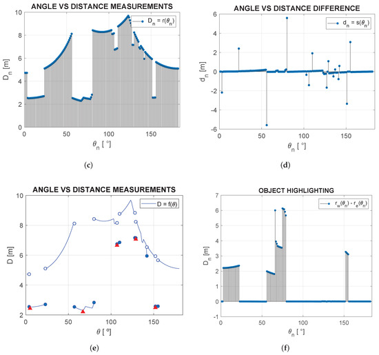 In the preceding text, Definition 1 delineates how the agent perceives its navigation surroundings. It is noteworthy that, as inferred from Corollary 2 and Definition 3, f is differentiable across a significant portion of its domain. Points where f lacks differentiability hold crucial significance, especially in the context of defining objects within a LASER’s scan data. It is essential to highlight that for all in and all D in , their extreme values are contingent upon the model and manufacturer specifications of the sensor device.