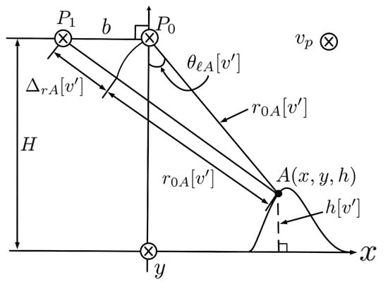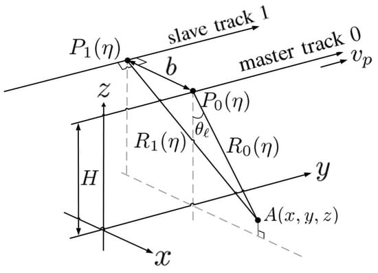 Figure 1 shows the schematic of InSAR operation with two parallel flight paths, where the x, y, and z axes are aligned in the ground-range direction, azimuth direction, and height direction, respectively. denotes a point target, and the platform flies at height H above ground, with the side-looking angle to .
