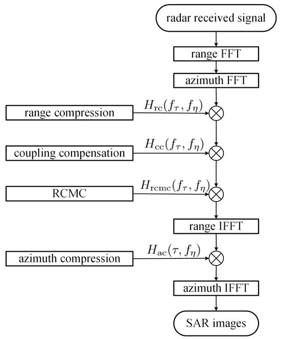 Figure 2 shows the flow-chart of the range-Doppler algorithm (RDA) used in this work [49]. The signal backscattered from the point target and received at () is demodulated to the baseband as