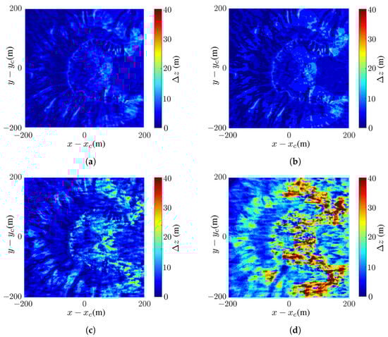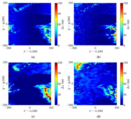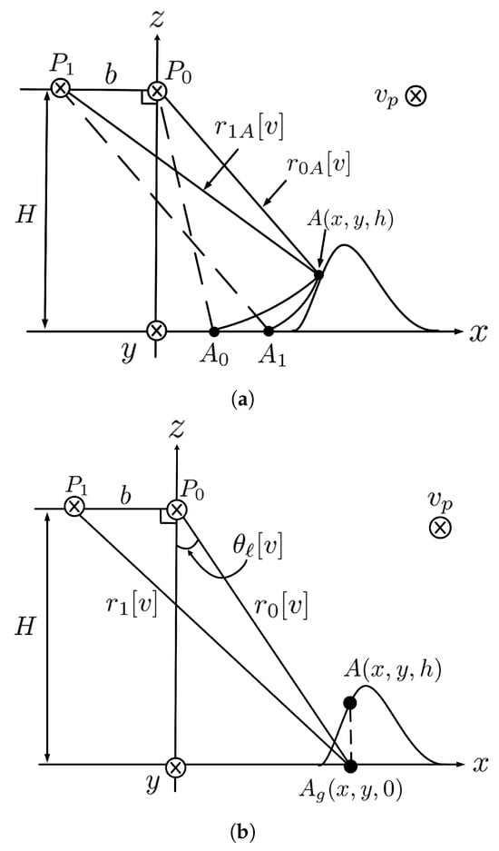 Figure 4a shows that the point target appears at in the master image and in the slave image. If the platforms fly high enough, the range difference between the two tracks in Figure 4a can be approximated as that in Figure 4b, namely, . By the law of cosines, can be represented as . The range difference is normalized with respect to to have .