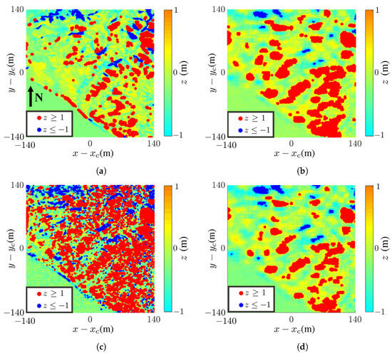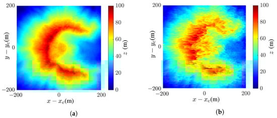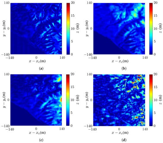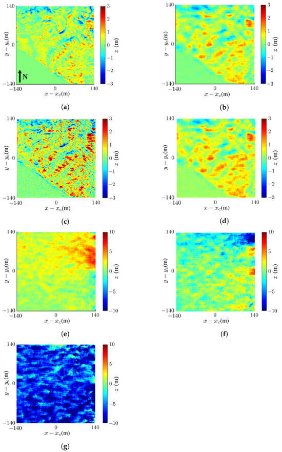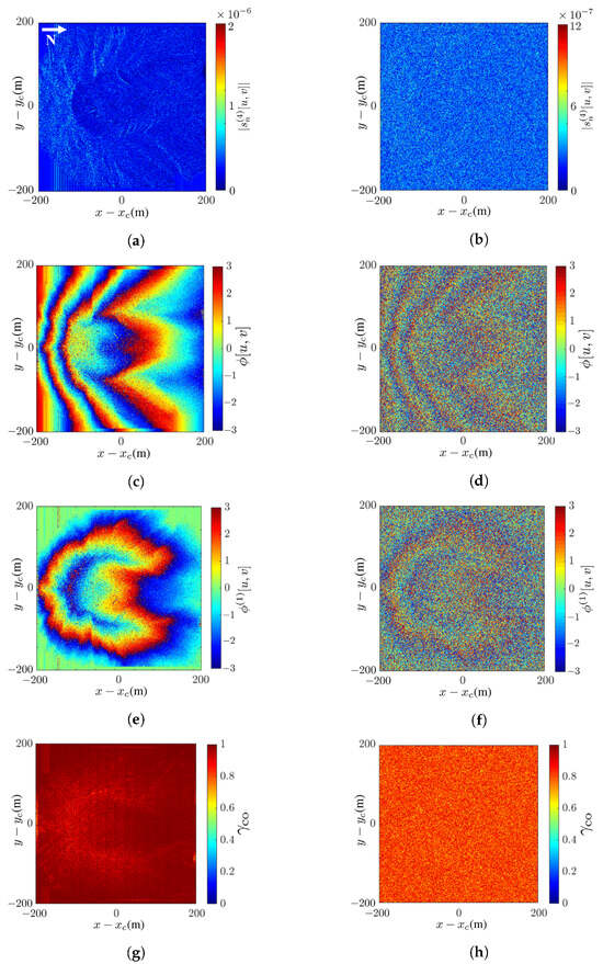 Figure 6g,h shows the coherence maps without noise and at SNR dB, respectively. The coherence between the master SAR image and the coregistered slave image is defined as [54]