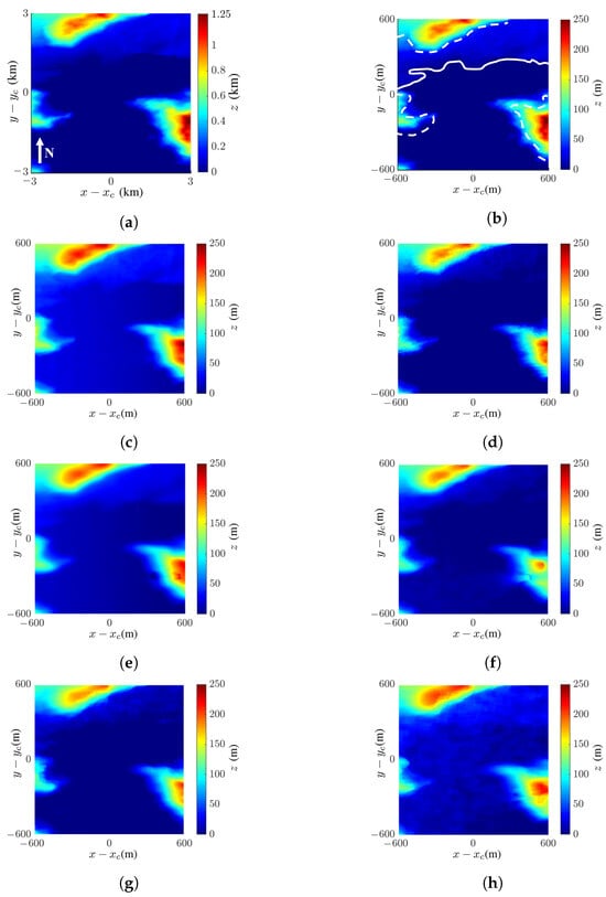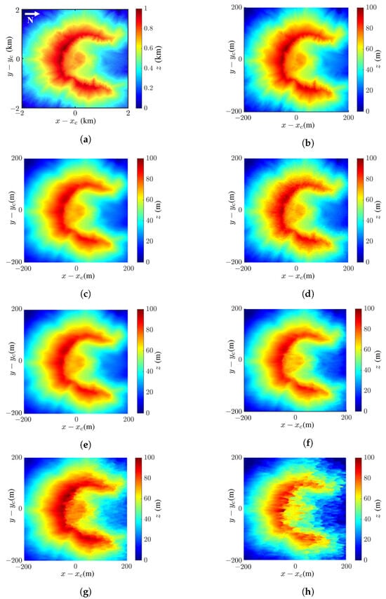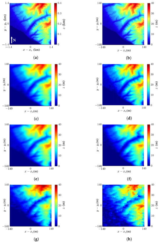 Images of Mount St. Helens: (a) DEM extracted from USGS 3DEP dataset [48], (b) tenfold scale-down model of DEM in (a); reconstructed DEM with (c) proposed method (MF and LSPU), SSIM , RMSE m, (d) NF [15,53] and LSPU, SSIM , RMSE m, (e) MF and QGPU [25], SSIM , RMSE m, (f) proposed method at SNR dB, SSIM , RMSE m, (g) proposed method at SNR dB, SSIM , RMSE m, (h) proposed method at SNR dB, SSIM , RMSE m.