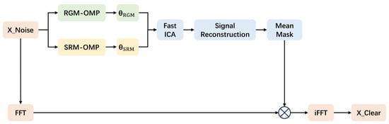 In Figure 1, when denoising and reconstructing the noisy signal X_Noise, the proposed DTM_OMP_ICA algorithm employs OMP algorithms based on two different observation bases (RGM-OMP and SRM-OMP) to construct a dual-path process. This results in obtaining distinct sparse representations, namely, and , for the noisy signal X_Noise. The algorithm combines the usage of the ICA algorithm (Fast ICA) to decouple and obtain sparse representations most correlated with the X_Clear component in the noisy signal X_Noise, achieving denoising and reconstruction of X_Noise. To ensure that the reconstructed signal retains the frequencies and corresponding amplitudes of X_Clear from X_Noise as much as possible, a mean mask technique is applied based on the frequency domain mean of the reconstructed signal. This technique generates a mask matrix suitable for the frequency domain of X_Noise, multiplies it with the spectrum of X_Noise, and employs inverse Fourier transform for denoising and reconstructing the noisy signal X_Noise.