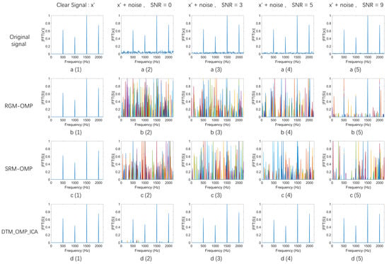 Table 2 indicates that the RGM-OMP algorithm had the lowest time cost for reconstructing noisy multi-frequency signals, followed by the SRM-OMP algorithm, but the difference is minimal. The proposed algorithm, which employs both RGM-OMP and SRM-OMP to construct a dual-path process and combines them with ICA to find the most relevant sparse representation of the clean signal in the noisy signal, incurred the highest time cost. However, it was still less than the sum of the time taken by the RGM-OMP and SRM-OMP algorithms.