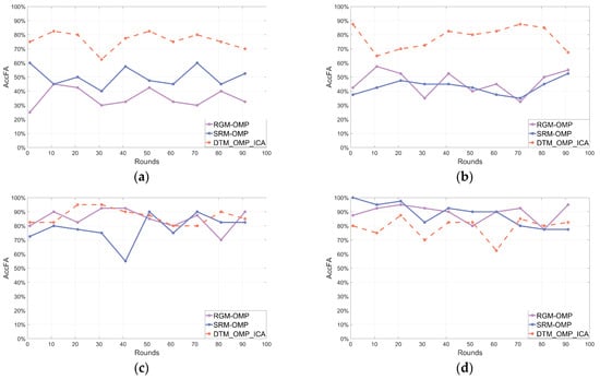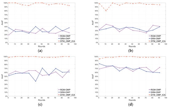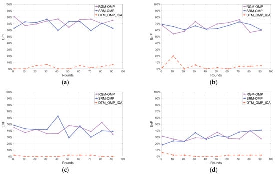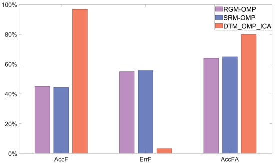The results shown in Figure 7 indicate that the proposed DTM_OMP_ICA algorithm excelled in the accuracy of reconstructing signal frequencies (), achieving an average accuracy of 96.8%, significantly surpassing RGM-OMP with 45.01% and SRM-OMP with 44.38%. In terms of the error rate of reconstructed signal frequencies , DTM_OMP_ICA was at 3.18%, much lower than RGM-OMP at 54.99% and SRM-OMP at 55.62%. Additionally, DTM_OMP_ICA attained an accuracy of 79.88% in reconstructing the frequencies and amplitudes of signals (), surpassing other algorithms by 15.94% and 15%, respectively.