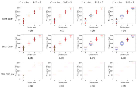 In contrast, the frequency clustering results of the signal reconstructed by the DTM_OMP_ICA algorithm proposed in this paper show that the average value of each frequency cluster is closer to the frequency of the original noise-free signal, and the variance within the four frequency clusters is near zero. Even in a strong noise interference environment with an SNR of 0 dB, the frequency clustering results of the signal reconstructed by the DTM_OMP_ICA algorithm demonstrate that the average values of the four frequency clusters are closer to the frequencies of the original noise-free signal, with the variance within each cluster being significantly low (0.07, 0, 0.0042, 0.005), as illustrated in Figure 8(c(1)). The occurrence of outlier frequencies within each clustered frequency is greatly reduced compared to Figure 8(a(1),b(1)). Similarly, under noise interference of 3 dB, 5 dB, and 9 dB, the frequency clustering results of the signal reconstructed by the DTM_OMP_ICA algorithm show that the average value within each frequency cluster matches the original noise-free signal frequency exactly, and the variance is closer to zero. The experimental results indicate that the DTM_OMP_ICA algorithm’s stability in reconstructing noisy multi-frequency signals surpasses that of traditional OMP algorithms.