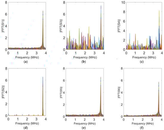 Figure 9a displays the spectral graph of the noisy echo signal S1 received by 86 array antennas. Subsequently, Figure 9b–f each present the spectral graphs of signals processed through various denoising algorithms, including RMG-OMP, SRM-OMP, DTM_OMP_ICA, SVD decomposition denoising, and wavelet threshold denoising. The signals reconstructed by these algorithms are, respectively, denoted as S3, S4, S2, S5, and S6.