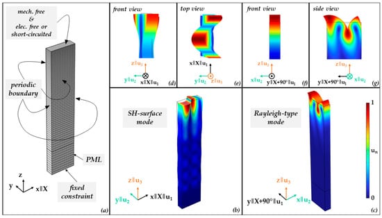 Finite-element (FEM) software COMSOL Multiphysics 6.2 is used to perform a modal analysis to search for configurations supporting different modes [15] and, more specifically, where both SH-LSAW and sagittal-polarized wave can be electromechanically excited on the same cut and which directions are beneficial for the excitation of sagittal-polarized wave and of SH-LSAW, respectively. The 3D model (Figure 1) consists of a lithium niobate block of 1 µm in length with 20 mesh elements, exactly one element of 0.3 µm in width and 4 µm in height with 80 elements. The 80 elements have an exponential grow, rate where the lowest element is 5 fold the size of the element at the top. This is set to ensure a finer mesh in the surface region. Surface domains facing length and width directions have periodic boundary conditions. The material constants for lithium niobate are chosen according to [16]; see Table A1. Additionally, a perfectly matched layer (PML) domain of 1 µm height and ten elements in global z direction is used at the bottom to suppress ground reflection of bulk components at the lower boundary with fixed constraint. Crystallographic X-axis of lithium niobate corresponds to global x-coordinate and the 64°-rotated Y-cut corresponds to the x-y plane of the model.