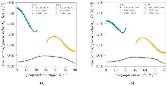 An eigenfrequency study with a parametric angular sweep about the global z-axis reveals for a rotation of 0°, the existence of an SH eigenmode (Figure 1b) with a complex eigenfrequency of f = Re(f) + j∙Im(f) = (4695.96 + 4.5361j) MHz, where the very small imaginary component indicates the related acoustic damping caused by leakage into bulk acoustic waves (BAW). This eigenmode corresponds to the well-known shear-horizontal polarized leaky wave (SH-LSAW) propagating along the X-axis of 64LN. Considering as wavelength λ the spatial periodicity of 1 µm along the length coordinate as defined by the periodic boundary condition and the real part of complex eigenfrequency f, Equation (1) yields the real part of the complex phase velocity v of the corresponding SH-LSAW mode for free (electrically open) surface, which results in 4695.96 m/s (Figure 2a). This value differs by only 0.084% compared to [14].