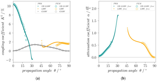 is calculated for the modes as a function of the propagation angle. For this, eigenfrequency analysis and PWA are performed for the whole angular range under the same conditions like before but with an electrically short-circuited substrate surface. K2 for the leaky SH-SAW at 0° has been calculated to 10.46% which is very close to the value of 11% given in [19]. The leaky Rayleigh-type wave has a K2 of 1.6% at 90° propagation angle whereas the coupling of the GSAW mode for the angles 0° and 90° is zero (Figure 3a). This means it is practically non-piezoelectric for these directions and can therefore not be excited by electrical fields but by scattering effects [14] making it useless for devices. An interesting effect is also seen in case of the SH-LSAW for angles with high attenuation, where K2 even reaches negative values when calculated formally using Equation (2) [20]. Note for comparison that commonly used STX-quartz has a K2 of only 0.12% [19]. Another important feature for the technical deployment of waves is their attenuation, what is especially important for all leaky modes. Figure 3b shows the attenuation coefficient αdB/λ calculated from complex phase velocity components using Equation (3).
