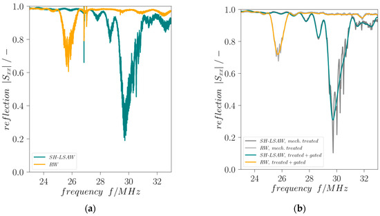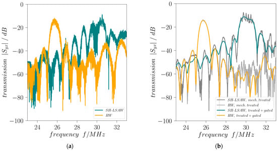 Mechanical treatment is applied to the DM-DL devices in order to reduce influences of parasitic BAW contributions as well as distortions caused by edge-reflected surface wave components. Comprising a waffle-weave pattern cut into the chip backside and applying photoresist at the edge-facing end of all IDTs this treatment proves to be effective as the curves of reflection coefficients |Sxx| and transmission coefficients |Syx| are significantly less distorted (Figure 4 and Figure 5). Moreover, the destructive acoustic interference in the SH-LSAW transmission curve at approximately 30 MHz is also prevented (Figure 5a,b). Further improvement of all S-parameter curves is achieved by signal processing that includes Fourier transformation, application of appropriate gating in the time domain to suppress non-mode-specific contributions and back-transformation into the frequency domain.