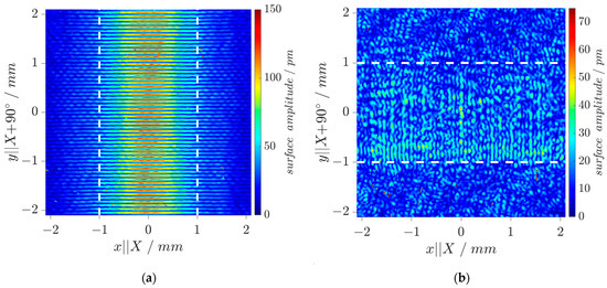 The wavefield of an DM-DL device is experimentally investigated by Laser-Doppler-Vibrometry (LDV, UHF-120, Polytec, Waldbronn, Germany) to validate results of the mode simulations. Figure 6a shows measured displacement amplitudes in surface-normal direction (i.e., parallel to global z-axis) for a Rayleigh mode pattern along y‖X+90° direction at 25.69 MHz with both IDTs activated to check their correct operation. The maximum displacement of the resultant standing wave pattern reaches u3,max = 120 pm. Figure 6b shows displacement amplitudes for the SH-LSAW at 29.72 MHz under the same operation conditions. As expected from modal analysis, the surface-normal displacements (u3,max = 37 pm) are much smaller here compared to the Rayleigh mode. Nevertheless, the characteristic standing wave pattern can be clearly identified within the IDT aperture.
