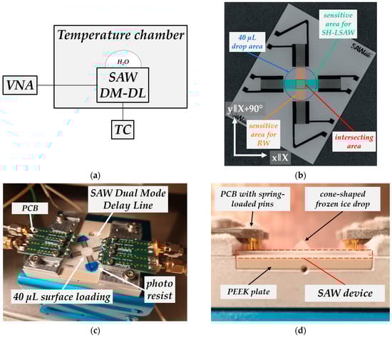 (a) Scheme of experimental setup; (b) dual-mode delay line device with acoustic area and loaded area; (c) device setup inside temperature chamber; (d) frozen drop on device.