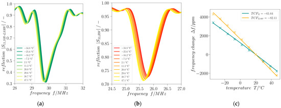 The frequency shift of the minimum of reflection |Sxx| provides information about the actual device temperature which can be deployed as additional indicator for the presence of icing conditions. Figure 8 shows the according frequency shifts of time-gated reflection curves for SH-LSAW and Rayleigh-type waves (path directions X and X+90°, respectively). There is a linear temperature behavior obtained for both modes in the investigated range of −30 °C to 50 °C yielding temperature coefficients (TCF) calculated from the shift of minimum |Sxx| of TCFX = −61.62 ppm/°C and TCFX+90° = −82.11 ppm/°C w.r.t 20 °C as the reference.