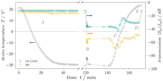 A waiting time of 20 min after water drop application is held to ensure stable S-parameter until the heating to room temperature is initialized. The increase in air temperature inside the chamber leads to dew formation on all surfaces which include the DM-DL device transducers, leading to additional attenuation while the water droplet is still mostly frozen. As soon as the device temperature reaches 15 °C, the dew vaporized again clearing the IDTs from any liquid. After the heating period to room temperature (23 °C) of approximately 30 min, the device sensitive area is loaded with melted water only. A final S-parameter measurement is performed after completely removing the liquid water to ensure same transmission values before and after the experiment.