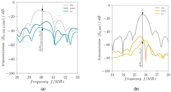 Effect of surface loading on DM-DL transmission characteristics (a) |S21,SH-LSAW| and (b) |S43,RW| (dry: no surface load, water: 40 µL water with complete wetting (both at 23 °C); ice: 40 µL ice (−30 °C); all curves are time-gated).