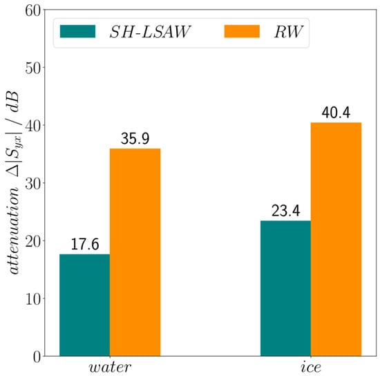 Figure 10 illustrates the measured transmission curves at the beginning (t = 0) of the experiment without surface load (dry), at approximately 137 min with ice loading and at end just before drying the surface with liquid water loading. Both acoustic modes propagating in perpendicular directions on the DM-DL device experience a different degree of attenuation in response to surface loading by liquid water which leads to a decrease in the corresponding transmission curves. Moreover, for both modes freezing of the liquid leads to a further decrease in the transmission. Important to mention, an ideal SAW attenuation is indicated by a nearly constant decrease in transmission over the whole frequency range whereas here also (changing) dielectric properties of the water drop loading will influence the characteristics [21]. As expected, the shear-horizontal polarized wave shows a lower attenuation compared to the Rayleigh-type wave. This is due to the neglectable out-of-plane displacement of an ideal SH-LSAW at the substrate surface, where the Rayleigh wave has its maximum surface-normal particle displacement, leading to strong acoustic leakage by radiation of longitudinal BAW into the surface load for the latter case. Moreover, an SH-LSAW shows only weak shear coupling to liquid loads like water with a low dynamic viscosity of approximately 1 mPas at room temperature [22]. Nevertheless, in the device under test the SH-LSAW experiences acoustic leakage as the real wavefield shows also minor particle displacement in surface-normal direction as revealed by LDV measurement (Figure 6b). This non-ideal behavior leads to a mechanical coupling to the liquid water load, which results in the decrease in |S21,SH-LSAW|. With increasing viscosity during the freezing process also the applied shear forces lead to shear stress at the interface between load and substrate surface what results in a further decrease in the transmission coefficient. The sagittal polarized Rayleigh-type wave with its major particle displacement in surface-normal direction witnesses a high attenuation |S43,RW| under liquid water loading right away which even increases during the freezing process. A quantitative view on the load-dependent increase in attenuation for both modes provides Figure 11. At the DM-DL operating frequencies defined by the center frequency between the zeros next to the transmission main lobe a dramatic increase in almost 36 dB in Rayleigh-mode attenuation is present for water loading, further increasing by 5.5 dB when the water freezes. In contrast, SH-LSAW experiences generally a much lower increase in attenuation due to surface loading with differences of ~18 dB for liquid water and ~23 dB when it freezes.