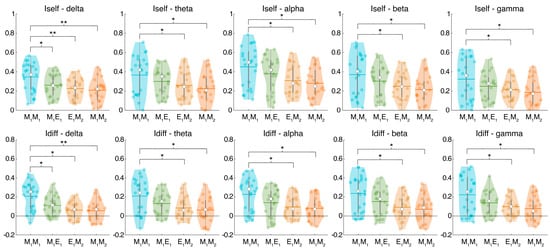 Iself and Idiff for each frequency band. Violin plot of the fingerprint scores representing the similarity between two functional connectomes (FCs) of the same individual obtained at different time points (Iself), and the extent to which an individual is differentiable within the dataset considering each case (Idiff). Colored dots represent the individuals, horizontal lines represent the average value, and white dots represent the median value. M1M1 compares the two recordings performed during the first morning (9:00 a.m. on day 1)—1 min distance; M1E1 compares the FC of the first morning and the FC of the evening (9:00 p.m. on day one)—12 h distance; E1M2 compares the FC of the evening and the FC of the second morning (9:00 a.m. on day two)—12 h distance including sleep deprivation; M1M2 compares the FC of the first morning and FC of the second morning—24 h distance including sleep deprivation. * = pfdr < 0.05, ** = pfdr < 0.01.