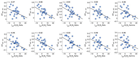 After the identification of the significant differences between the four combinations, a correlation analysis (Pearson’s correlation) was carried out. In detail, we performed a correlation test between the Iself and Idiff fingerprint metrics of the groups M1M2 and E1M2 (the ones presenting significant differences across all frequency bands) and the differences in scores within the respective time points on the cognitive tests (LCT, TS), subjective sleepiness evaluations (KSS), and stress perceived in performing the cognitive tests (NASA-TLX). Specifically, the notation “” refers to the difference between the specific “” subscore of the NASA-TLX test between two sessions. For instance, if the subscore “” (effort) is considered between the times and , then the adopted notation will be . Following FDR correction, we found that the Iself between the two morning recordings was inversely correlated with the ΔS in all frequency bands. Hence, the higher the similarity of the recordings after 24 h including sleep deprivation, the lower the perceived effort in performing cognitive tasks. The Idiff presented the same significant inverse correlations, suggesting that the more an individual was differentiable within the dataset, the lower the effort was in completing the cognitive tasks. None of the remaining tests reported significant correlations. Statistical data are reported in Table 1, while the scatter plots of the correlations are reported in Figure 3.