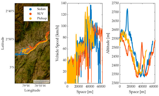 The tests were conducted without the presence of rain or strong winds, with the windows closed and without air-conditioning activated. The test vehicles carried two passengers and a full tank of fuel. According to the manufacturer’s recommendations, 92-octane fuel was used. The characteristics of the routes in real driving conditions are shown in Table 3 and are validated according to the guidelines in [20].