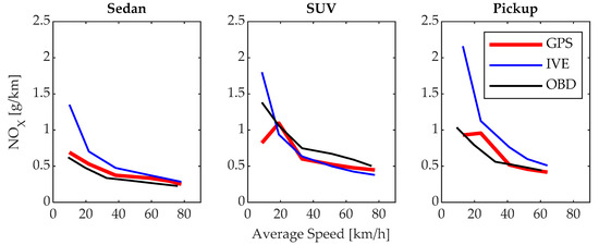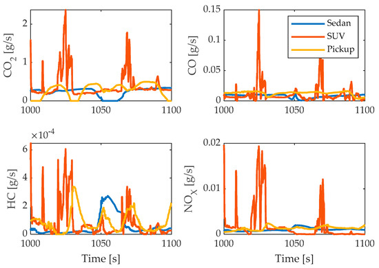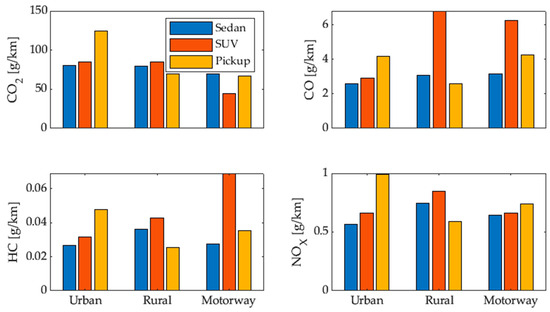 where is the mass of pollutant j and is the distance traveled in section k of the RDE test, where k takes the values of u, r, m for the urban, rural, and highway sections, respectively. The emission factors of each vehicle per section are shown in Figure 4.