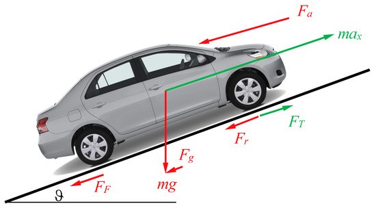 The longitudinal acceleration of the vehicle is determined by Equation (10), while the forces occurring during driving are applied as shown in Figure 5 and are related using Equation (11), where FT represents the tractive force and FF represents the braking force, and they are mutually exclusive.
