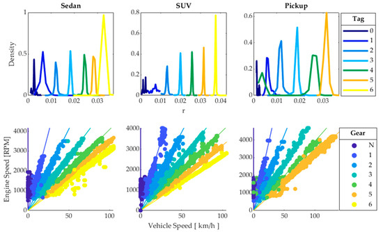 The test vehicles are equipped with manual transmission, and like 69% of the vehicles sold in Ecuador [21], they do not have sensors to determine the gear selected by the driver; therefore, it is necessary to determine this information from the OBD data using machine learning according to the process shown in [17]. The K-means algorithm is applied to the data acquired in the RDE test to cluster the vector r, which is calculated using Equation (12).