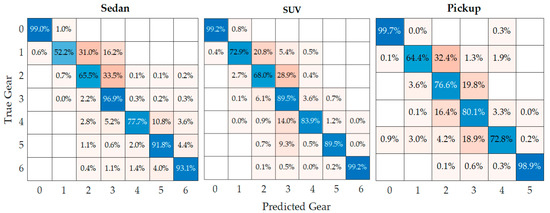 The values of VOBD and RPM are directly obtained through the OBD, so they cannot be used to train the GPS-based model. The gear used by the driver cannot be directly determined by VGPS since the gears selected do not depend exclusively on the driving speed. Given that gear usage during driving is random [27], supervised learning is employed, where the forces acting on the vehicle’s movement are used as predictors for classification trees, and the gear used by the driver is the output, whose labels were obtained from OBD data, making the training vector I = [VGPS, aX, Fr, Fg, Fa], [19]. From the training performed, three classification trees are obtained with 7, 7, and 6 splits to determine the gear of the sedan, SUV, and pickup vehicles, respectively; their training results are shown in the confusion matrices in Figure 7. These hyperparameters were determined based on the appropriate configuration of the maximum tree, which is quite simple, making pruning unnecessary. Cross-validation of the obtained trees is performed by randomly splitting the training data into several mutually exclusive folds. In each fold, a portion of the data is used for training and another portion for testing [28]. The data are divided into 5 folds, with each fold divided into 70% of the data for training and 30% for testing, resulting in an average test accuracy rate of 99.5%. The highest accuracy rates occur in neutral, 5th, and 6th gears, while in 3rd and 4th gears, the model’s efficiency decreases because the vehicle’s performance under these conditions is very similar.