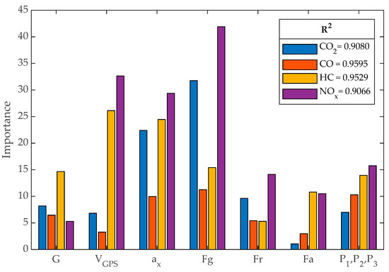 For variable selection with RF, the data obtained from the RDE of Route 1 for each test vehicle were considered. The inputs included all vehicle operating parameters obtained through GPS, while the outputs consisted of the resulting pollutant emissions. To reduce the variance contributed by the predictors to the model, a very effective technique called “bagging” was employed. This involves combining results from different CARTs obtained using different subsets of predictors from the same population [31]. For this purpose, continuous variables must be transformed into categorical variables through level discrimination [17]. The number of levels was set to 7, 110, 144, 144, 144, 144, 3, 3, and 3 for the variables G, VGPS, ax, Fg, Fr, Fa, P1, P2, and P3, respectively. The outcome of the most influential predictors is illustrated in Figure 8. The R2 factor estimates the quality of the fit that RF has achieved to determine the importance of the variables in each of the outputs [33]. It is determined by Equation (13), where is the vector of n predictions, is the vector of true values, and is their mean value.