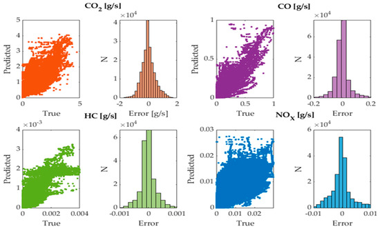 The obtained networks were applied using the data collected on Route 2 of the RDE test for the three vehicles as inputs to compare the results with the data measured by the PEMS. It was observed that the fit is very satisfactory according to the scatter plots and error distribution diagrams shown in Figure 9. The model errors exhibit a nearly normal symmetric behavior around 0, with no offsets in the estimation of each contaminant [37]. Moreover, they behave completely randomly, thus ruling out the inference of other variables not considered in the ANNs’ training.