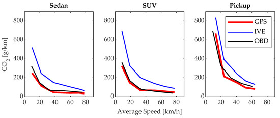 The emission of CO2 depends on the average driving speed. In Figure 10, the results obtained for the three analyzed vehicles are shown; in all three cases, the CO2 emissions are inversely proportional to the average driving speed, and the results of the IVE model are higher than those obtained by the other models, in accordance with what was shown in Section 1 [5]. The highest emissions are 249.91, 324.55, and 670.61 g/km, achieved at 9.95, 8.65, and 12.95 km/h using the first gear, while the lowest emissions are 35.1, 45.58, and 80.98 g/km, achieved at 78.15, 77.48, and 64.15 km/h using the highest gear in the sedan, SUV, and pickup vehicles, respectively. If a comparison is made among the three test vehicles, it can be observed that the highest emission values are found in the pickup, followed by the SUV and sedan; these values are proportional according to their weight and aerodynamics, among other factors. It is worth noting the close similarity between the results generated by the proposed model and the OBD-based model, as both are based on a large amount of data collected under real driving conditions.