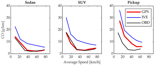 The emissions of CO shown in Figure 11 are inversely proportional to the average driving speed. The maximum emissions values are 18.04, 17.65, and 27.65 g/km, achieved when driving at the minimum average speed using first gear. As the driving speed increases, the minimum CO emissions are achieved, with values of 2.70, 2.95, and 5.95 g/km when using the fourth gear in the sedan, SUV, and pickup vehicles, respectively. When using gears higher than fourth gear, the emissions slightly increase, highlighting the importance of efficient driving and proper gear usage to reduce pollutant emissions. For the sedan and SUV vehicles, the results of the proposed model and the OBD-based model are very similar. However, there is a difference in the results for the pickup vehicle; this is because these vehicles are used as light-duty vehicles [38], which increases the engine load and consequently CO emissions due to incomplete fuel combustion [39].