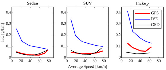 The HC emissions determined by the proposed model are very similar to those estimated by the OBD model in the sedan and SUV vehicles, with differences observed in the pickup category, as explained in Section 3.2. As shown in Figure 12, in all three vehicles, the emission factor is high at low speed values and high driving speeds, reaching a minimum emissions value of 0.0235, 0.0343, and 0.0573 g/km at 58.98, 51.28, and 51.98 km/h for the sedan, SUV, and pickup vehicles, respectively. Beyond this speed, HC emissions increase again. This occurs because at low speeds, the loading and RPM conditions are not optimal for generating efficient and complete combustion, while at high speeds, the loading and temperature conditions also affect combustion efficiency [39]. However, the behaviors are similar in all three test vehicles, indicating that the model is effective.