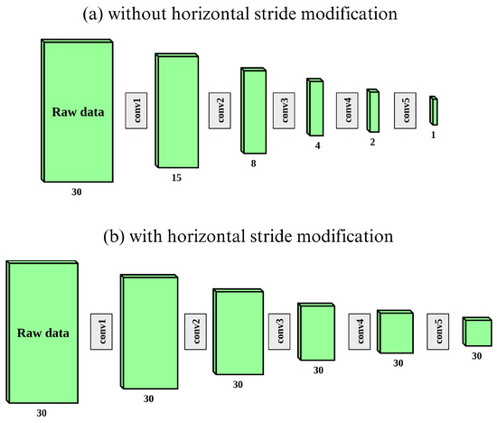 The used model is based on ResNet18 architecture with an ajdustment to raw GBSAR data. In the case of a smaller number of steps which corresponds to the dimensions of one axis in the resulting matrix, the architecture is modified by removing downsampling steps in that axis. Specifically, in our case, each column of the resulting matrix represents the signal obtained after mixing from one sensor (the FMCW module) position along the track. Therefore, the dimension of the vertical axis depends on the number of frequency points of that signal which is, in our case, 1024. The number of such signals in the resulting matrix (or the number of GBSAR steps) represents the horizontal spatial dimension and is, in our case, 20. In Ref. [16], it was shown that on occasions in which one spatial dimension is much larger than the other, it is beneficial to remove the downsampling steps of the smaller axis. This is achieved by setting the horizontal stride to one, which prevents the model from halving the horizontal dimension in each of the five convolution groups from regular ResNet18 architecture. The proposed modification is displayed in Figure 1. All classification models in this paper are based on ResNet18 with mentioned modification.