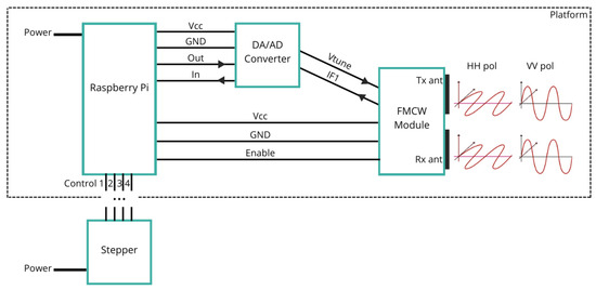 Scheme of GBSAR-Pi [24]. GBSAR-Pi is based on microcomputer Raspberry Pi and FMCW module. The module can emit horizontally or vertically polarized EM waves.