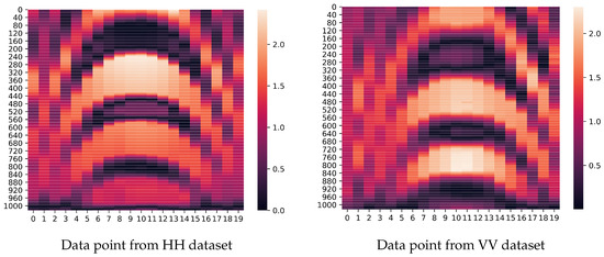 Since in all 100 conducted recordings, the scenes contained three objects, the datasets consist of 300 data points. Hence, there are 150 data points recorded with horizontal polarization in the ‘HH’ (horizontal) dataset and 150 data points recorded with vertical polarization in the ‘VV’ (vertical) dataset. Data points are matrices of dimensions 1024 × 20.