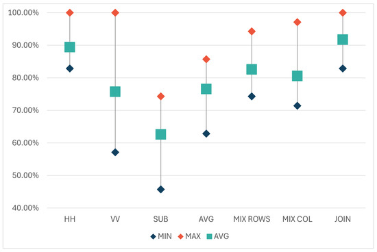 Minimum, maximum, and average classification accuracy of the HH, VV, SUB, AVG, MIX_ROWS, MIX_COL, and JOIN models.