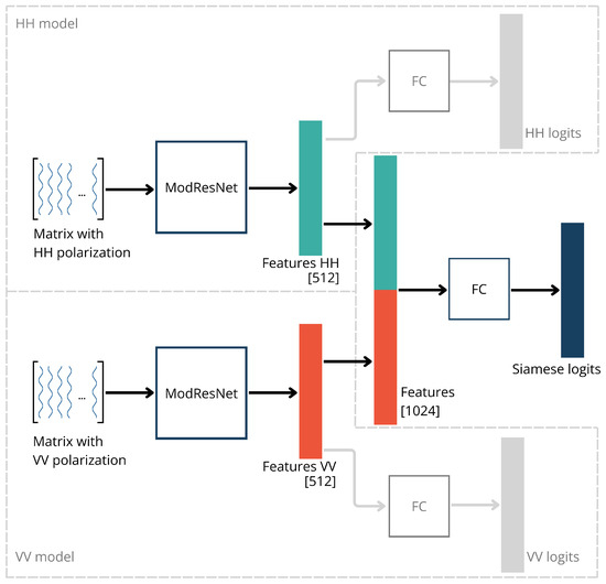 On the other hand, the results once again imply that the combination of the HH and VV matrices can be utilized to improve classification results. Therefore, we tested another approach in which two classification branches (one for each polarization) were trained in parallel. Each branch had an architecture similar to the ModResNet model, receiving a matrix of one polarization as input. Before the fully connected (FC) layer of the ModResNet models, the branches connected their feature vectors (each of size 512) in one feature vector (of size 1024) of the entire model, which was then fed into a fully connected (FC) layer. Subsequently, similar to the original model, probabilities for each class were calculated, and predictions were made. This model is hereafter referred to as the ’Siamese’ model, and its architecture is illustrated in Figure 8.