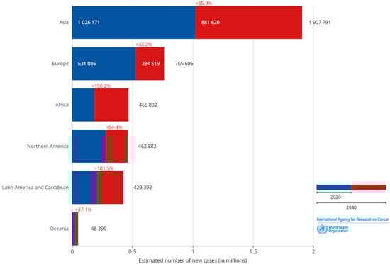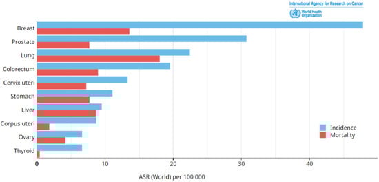 Breast cancer occurs when cells in breast tissues undergo uncontrolled growth and cell division. Breast cancer is classified into various types depending on the type of breast cell that becomes cancerous. According to statistics, breast cancer is considered the most predominant deadly disease globally, affecting both males and females, with a particular emphasis on women, and leading to significant mortality and suffering on a worldwide scale. An examination of the incidence and mortality rates issued in 2020 by the World Health Organization’s (WHO’s) International Agency for Research on Cancer revealed that breast cancer exhibited the highest occurrence among the various forms of cancer, as shown in Figure 1. The incidence of breast cancer in 2020 was estimated to be around 2,261,419 cases [1]. This organization’s studies indicate that this number is expected to rise significantly by 2040, reaching an estimated 4,074,871 new cases. This represents an alarming increase of 80%, as illustrated in Figure 2.