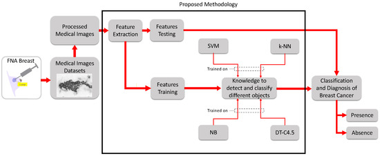 Pertaining to the proposed methodology, various procedures and steps were sequentially involved, as shown in Figure 3, starting from the collection of medical images of breasts, FNA data sets, and the decision-making process. The workflow is summarized as follows: