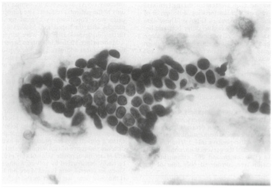 A sample of the FNA of a breast mass (Figure 4) indicates the types of images that were employed in this study. FNA of the breast is a minimally invasive procedure used to diagnose breast abnormalities, such as lumps, cysts, and suspicious masses. With FNA, skilled healthcare professionals insert a small needle into the breast, taking samples of cells or fluid for further analysis. FNA is a diagnostic tool that helps to determine whether breast abnormalities are malignant (cancerous) or benign (non-cancerous); that is, there are two classes. Such early classification aids in the development of appropriate treatment plans. The FNA image shown in Figure 4 exhibits the characteristics of the cell nuclei. The database class distribution was composed of 357 benign and 212 malignant images.