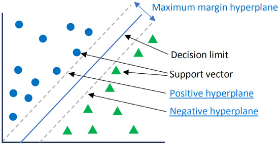 The SVM, which is also called a wide-margin separator, is a supervised ML algorithm [23,24]. SVMs are widely used in classification applications. SVMs are based on finding a hyperplane that best divides a data set into two classes. The hyperplane is a line separating and linearly classifying a set of data [23], and support vectors are the data points closest to the hyperplane. For instance, the data points shown in Figure 5 are classified in binary and are separated into two different classes. A decision boundary can be thought of as a dividing line where positive examples exist on one side, and negative examples exist on the other side. On this same line, data points can be classified as positive or negative. The parameters of the SVM used are as follows: