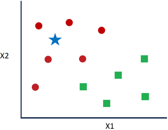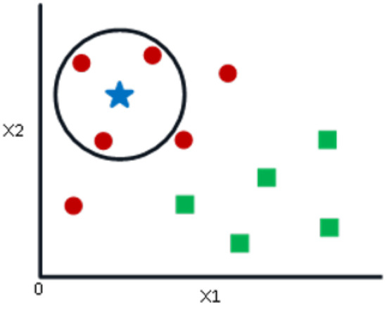 k-NN is used to classify target points (unknown class) as a function of their distances from points constituting a learning sample (i.e., the class of which is known a priori). k-NN is an intuitive supervised classification approach that is often used in the context of ML [27]. This is a generalization of the nearest neighbor (NN) method. NN is a special case of k-NN where k = 1. Given the series of red circles (RCs) and green squares (GSs) shown in Figure 6, if the intention is to know the blue star (BS) class, a BS can be an RC or a GS. The “k” in the k-NN algorithm denotes the considered number of closest neighbors.